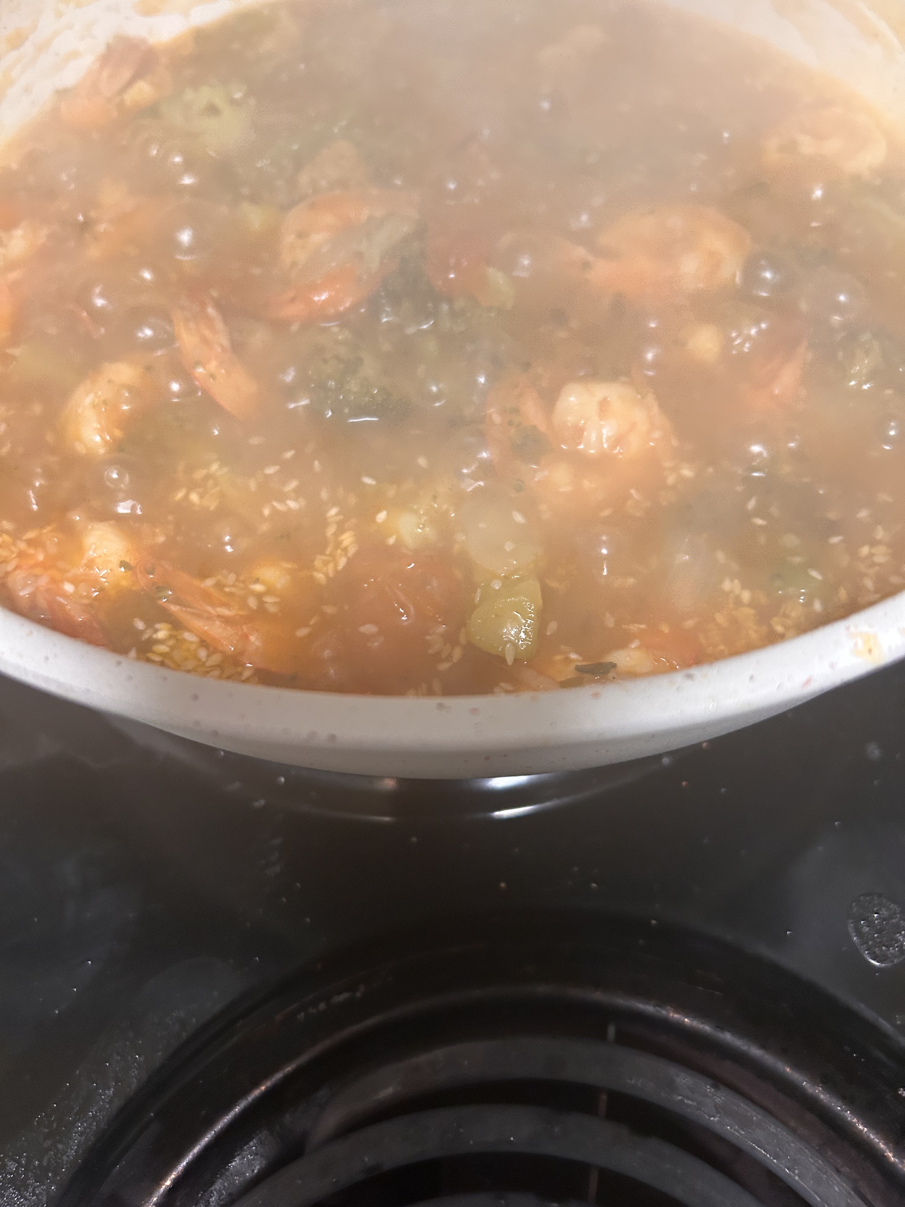Shrimp curry not sure I made it vaguely eastern spices ginger soy mirin Thai curry paste almost done and dollar tree fake siracha due to tariffs
